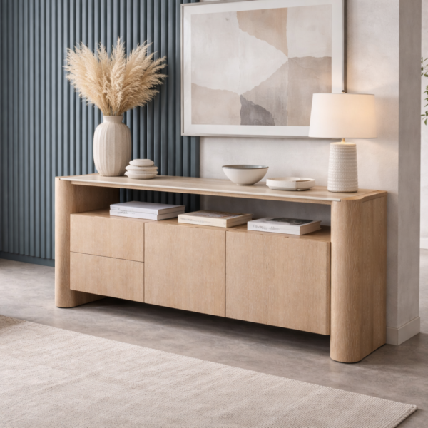 A sleek black curved sideboard with a premium marble-finish top, designed for refined modern interiors.
