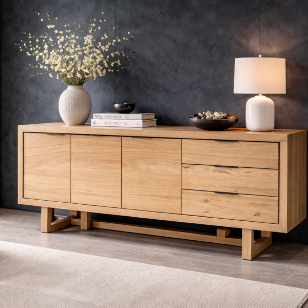 A bold black wooden sideboard with spacious drawers and open shelving, designed to add modern sophistication and smart storage to any space.