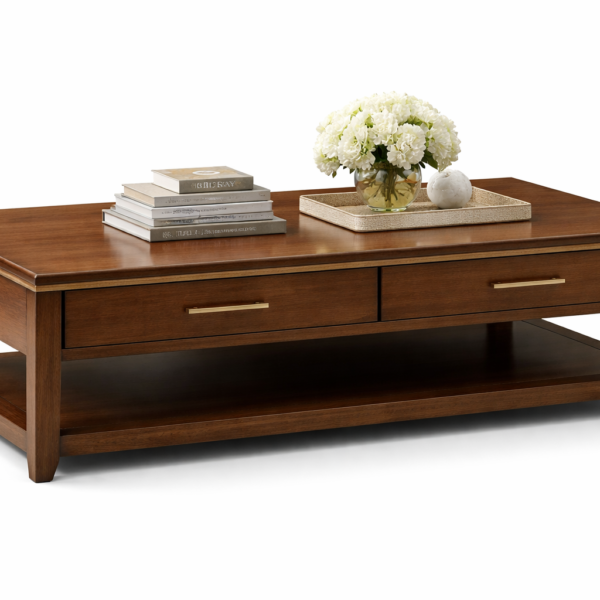 A timeless wooden coffee crafted with a rich walnut finish, featuring two smooth-glide drawers with sleek metal handles and a spacious lower open shelf for extra storage. Perfect for adding warmth and functionality to your living room.