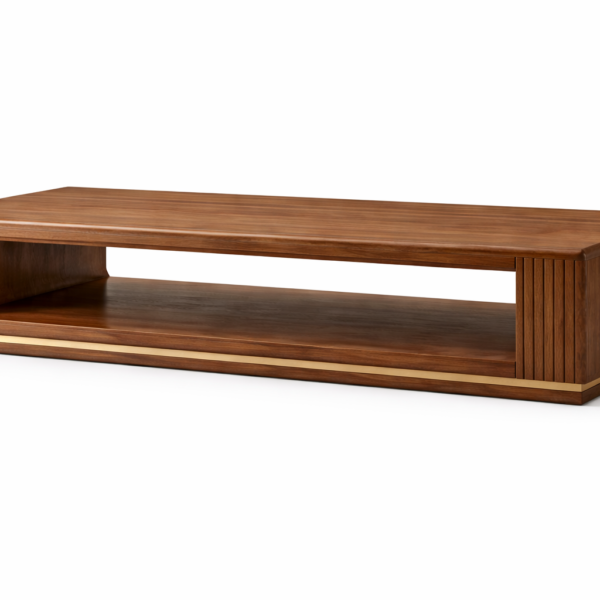 A luxurious solid wood coffee table featuring elegant vertical fluted detailing, a rich walnut finish, and a sturdy recessed platform base for a bold contemporary look.