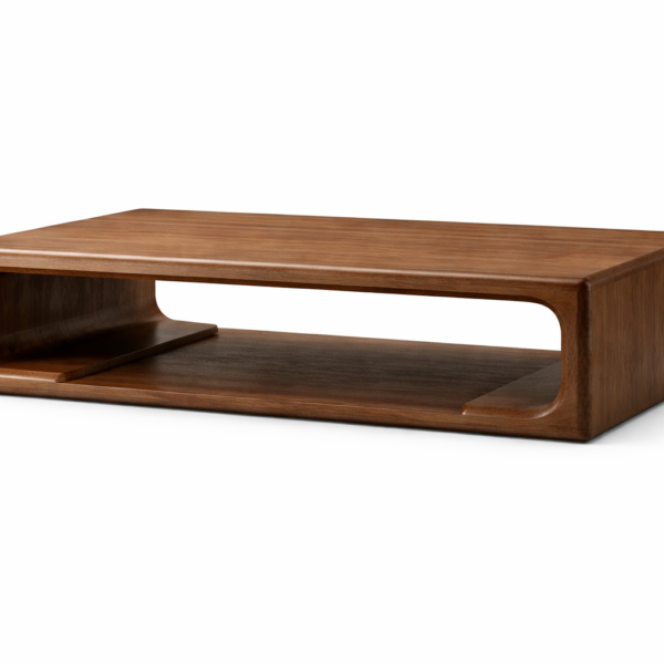 A sleek and minimal solid wood coffee table featuring a rich walnut finish and spacious open shelving. Designed with clean lines and fluted side detailing for a contemporary touch.