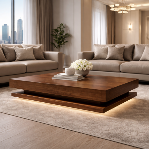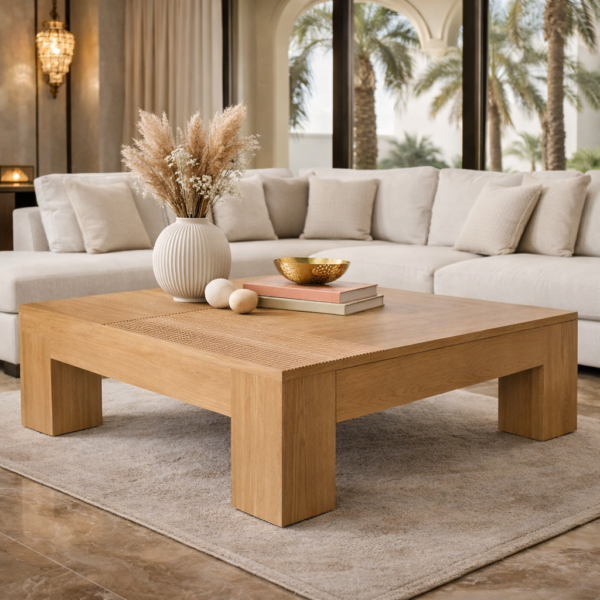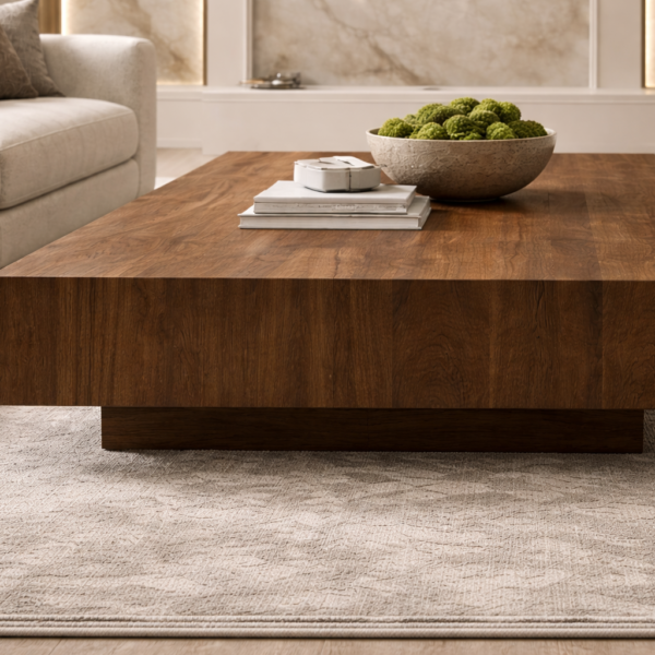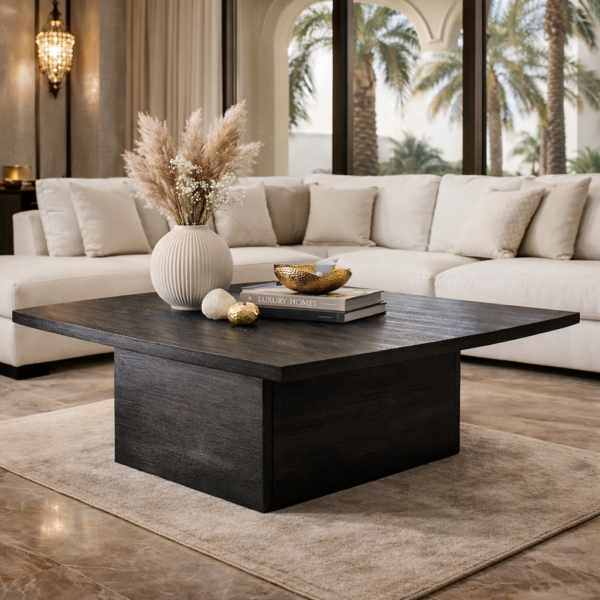 A bold and contemporary square coffee table featuring a deep wood finish and a sturdy pedestal base, designed to create a striking centerpiece in any living room.