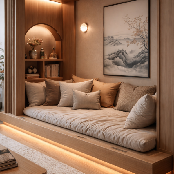 The Amber Glow Library Panel is a sophisticated wall paneling concept that merges architectural warmth with practical elegance. Crafted in rich natural wood veneer, the design features a fully integrated shelving system with concealed LED backlighting that casts a soft amber glow across displayed books and décor.