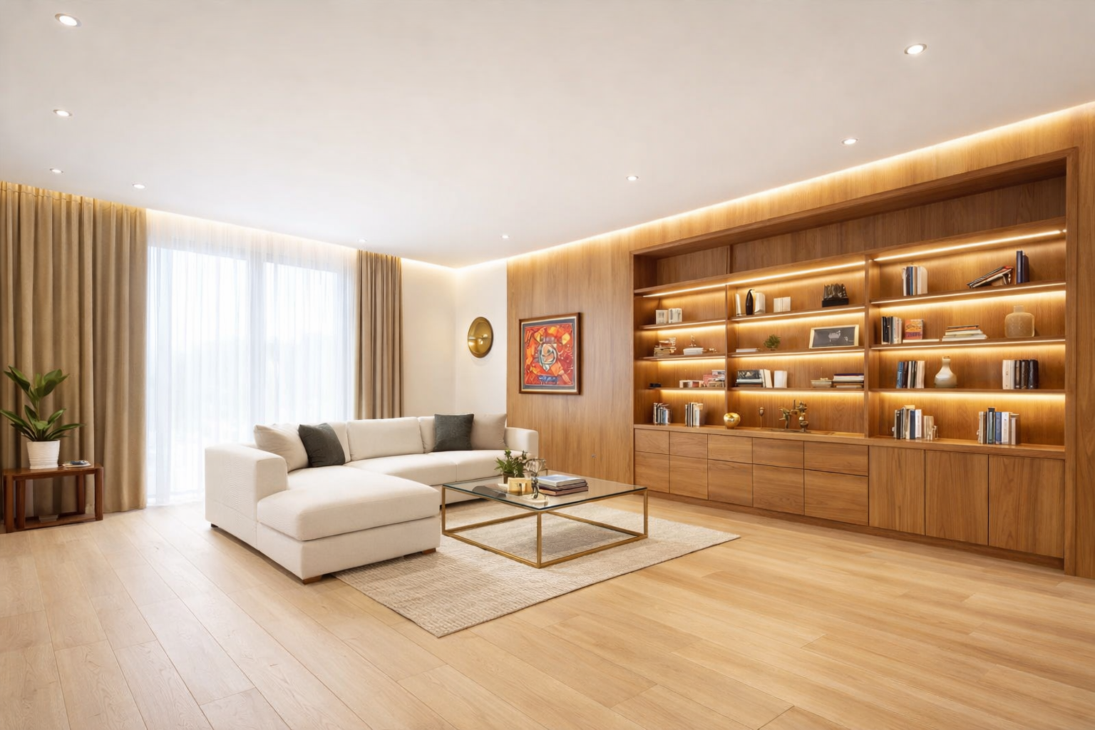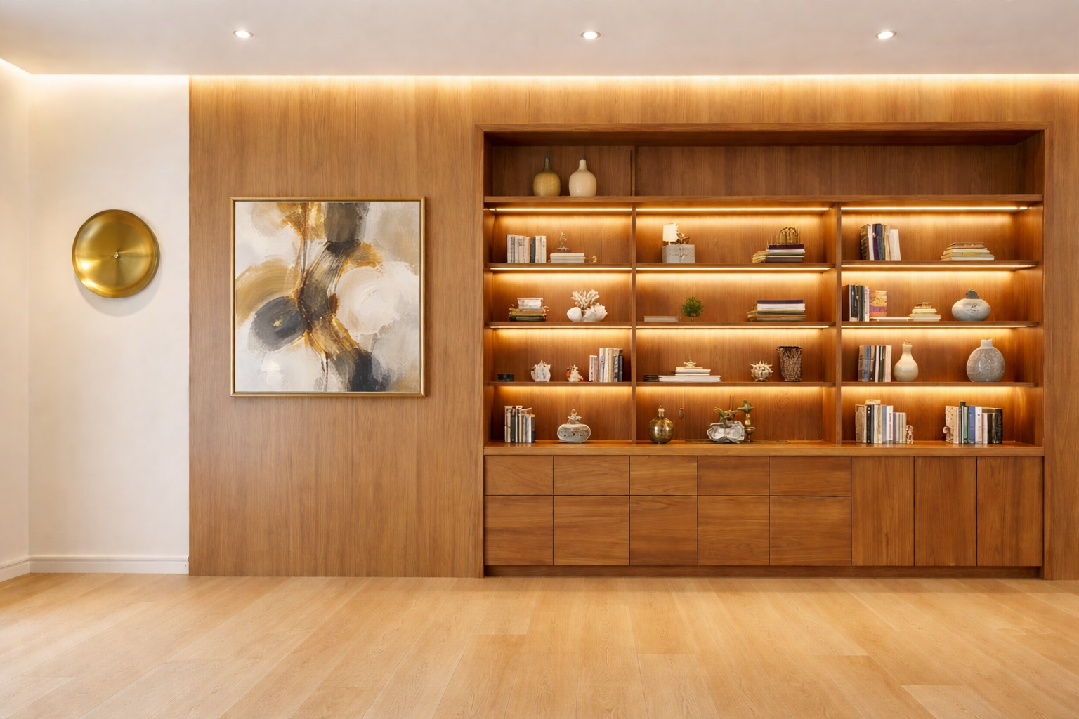 The lower section incorporates sleek handle-less cabinetry, maintaining a clean and minimalist façade while offering ample storage. The surrounding wood paneling ensures visual continuity, transforming the entire wall into a cohesive design statement rather than a standalone shelf unit. Perfect for living rooms, offices, lounges, or executive spaces, this wall panel system balances functionality and luxury, delivering depth, warmth, and contemporary refinement.