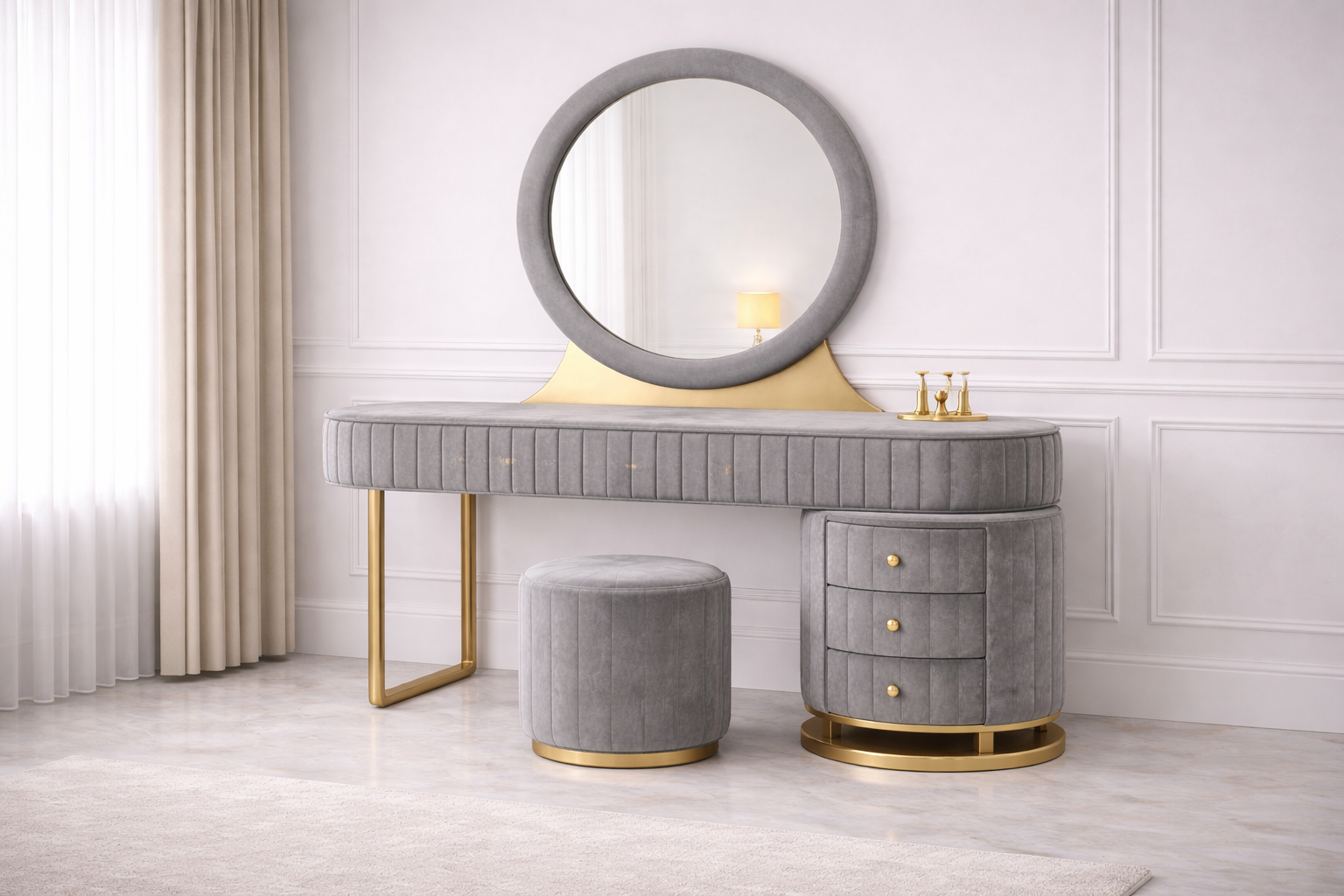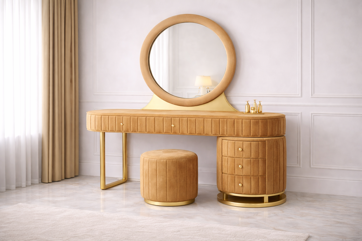 The Aura Round Luxe Dressing Table is designed to make a bold yet elegant statement in modern bedrooms. Highlighted by a perfectly balanced round mirror and a streamlined silhouette, this dressing table brings together sophistication and everyday practicality.