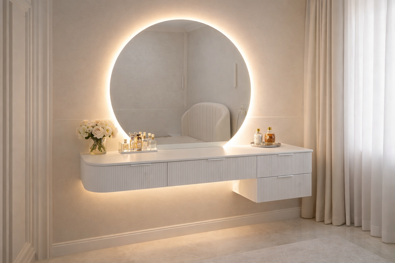Elevate your dressing area with this floating LED vanity table, designed for modern and space-conscious interiors. Featuring a striking round LED backlit mirror, it delivers soft, ambient lighting for flawless makeup application and grooming.