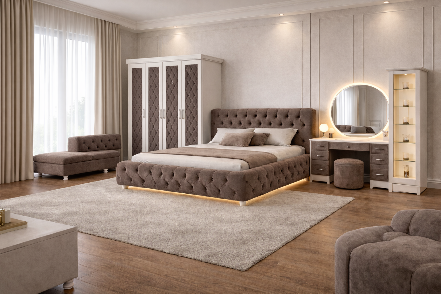 The Imperial Tuft Luxe Bedroom Set is crafted for those who appreciate refined design and premium comfort. The statement deep-tufted upholstered bed instantly elevates your space, while the LED-lit base adds a soft, ambient glow for a luxurious bedroom atmosphere.