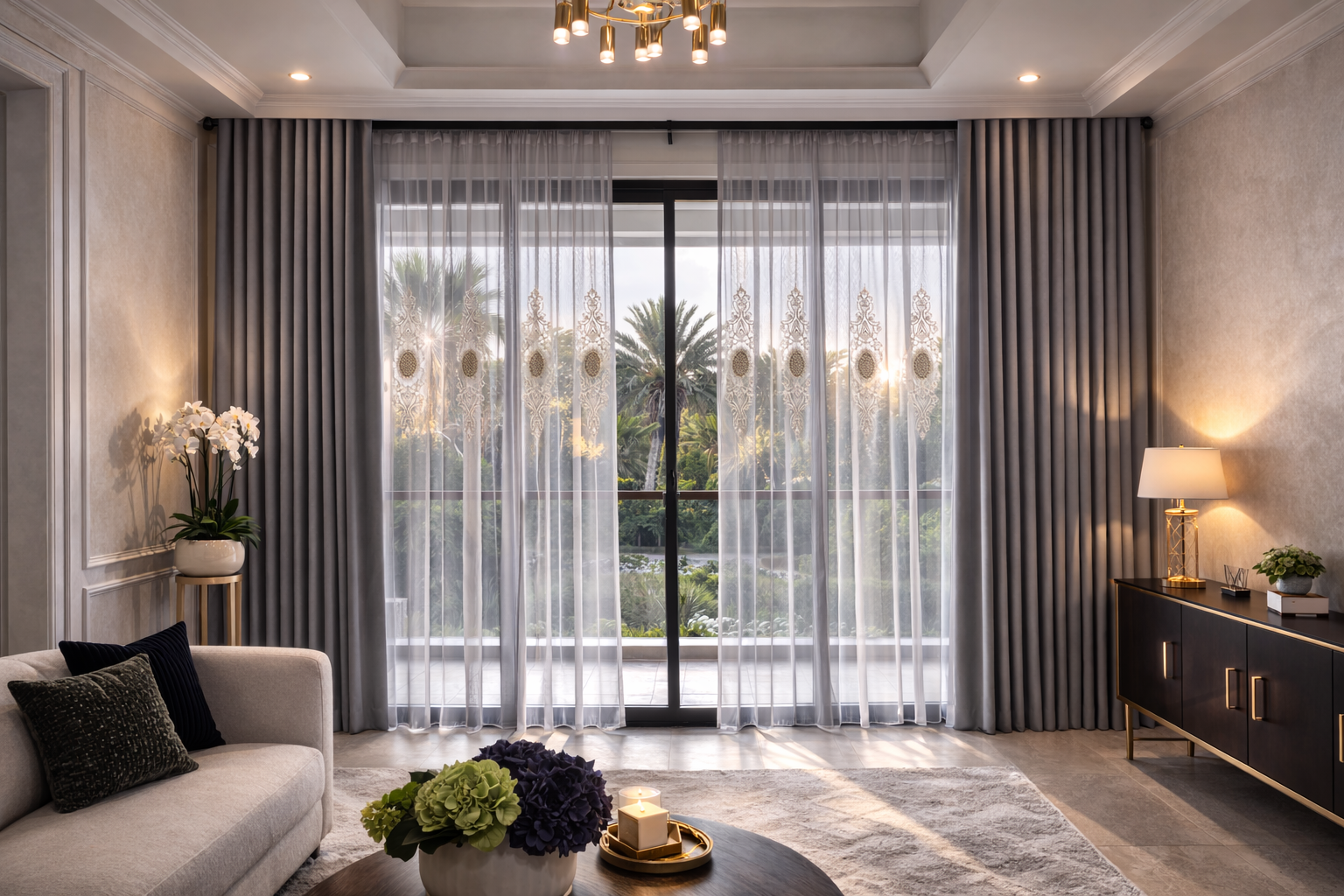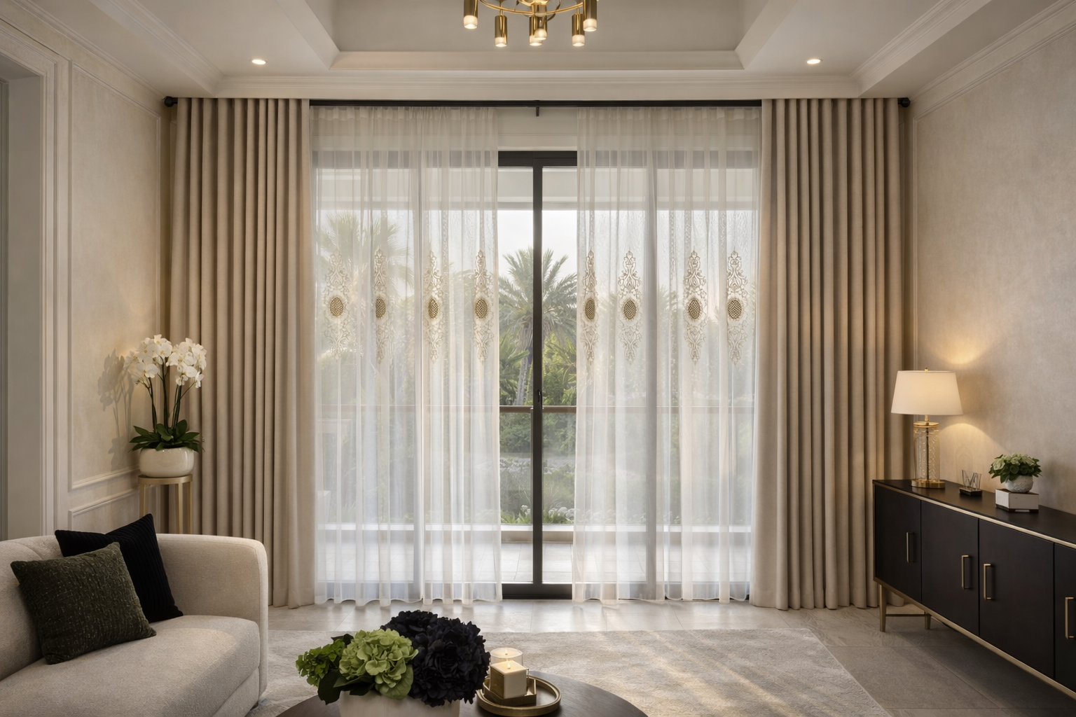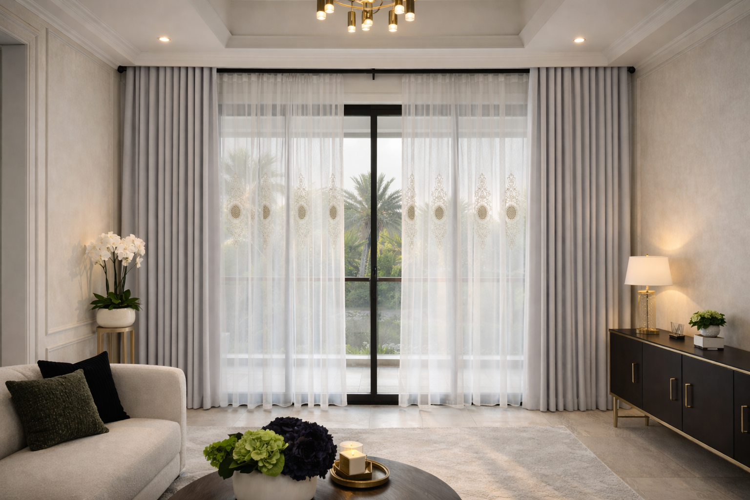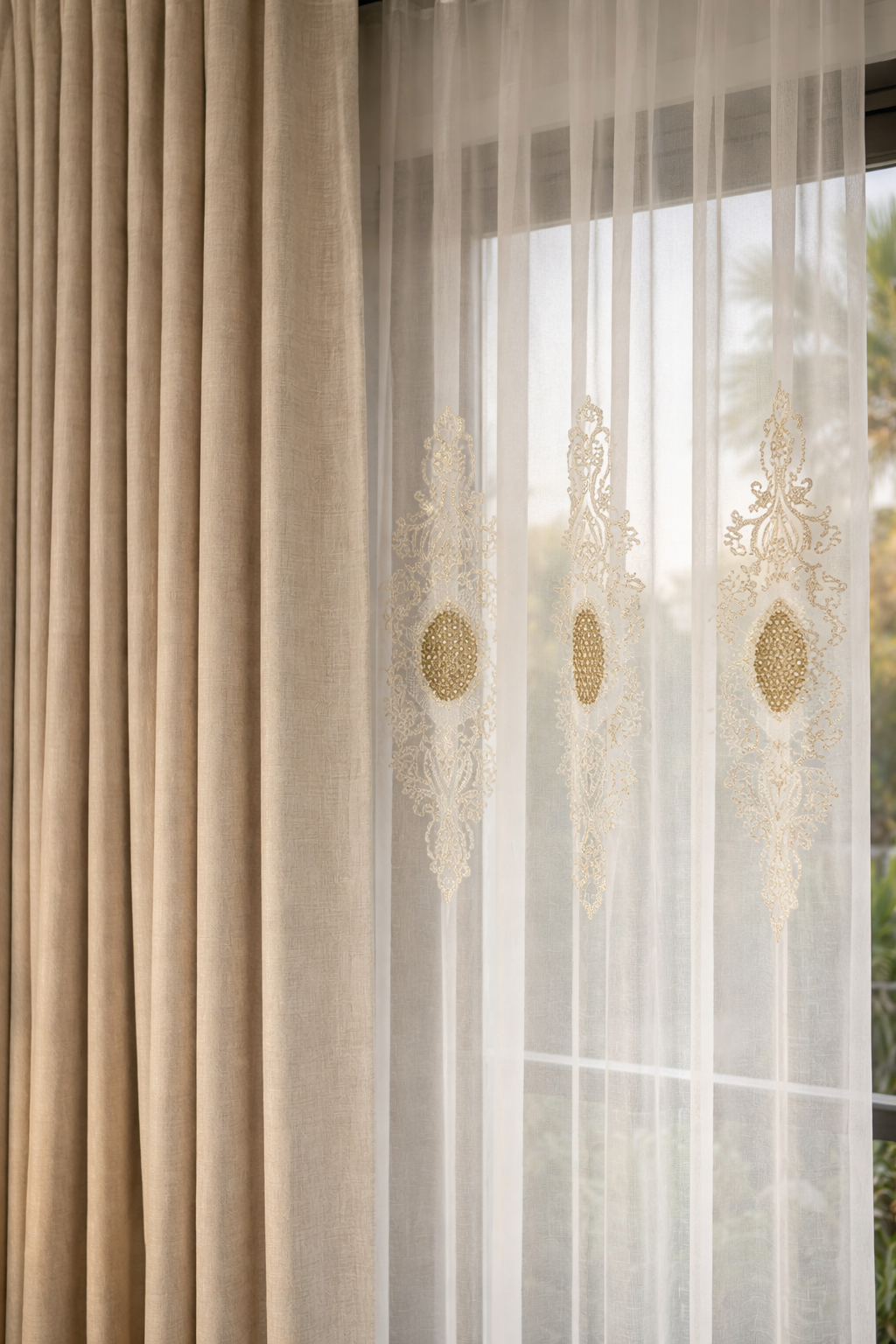 The subtle gold embroidered motifs add a luxurious touch, making it perfect for modern as well as classic home décor. Paired with neutral drapes, it creates a layered look that elevates your windows effortlessly.