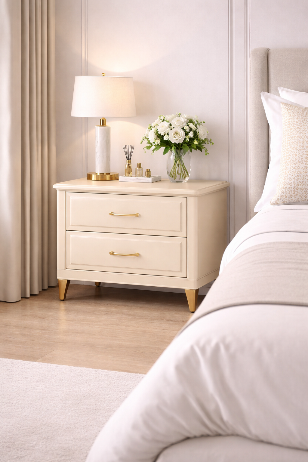 The Ivory Haven 2-Drawer Bedside Nightstand brings classic elegance and modern simplicity together in one beautifully crafted piece. Finished in a warm ivory tone, this nightstand features clean lines, smooth edges, and subtle gold hardware that adds a touch of sophistication.