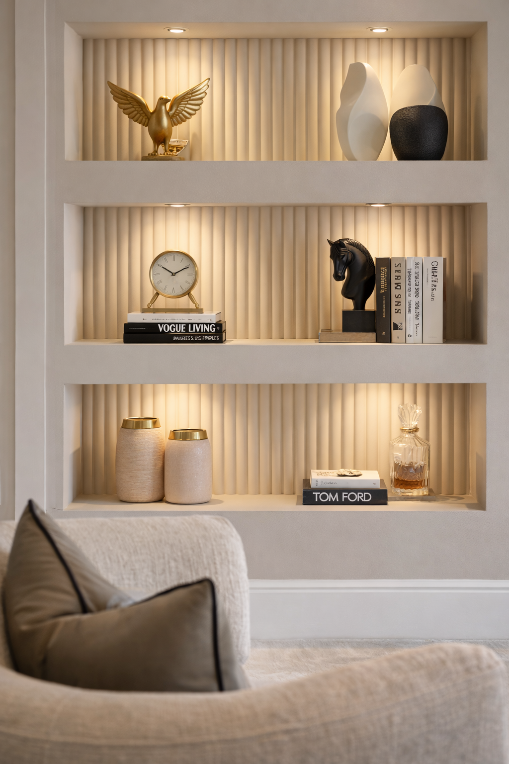 A refined recessed shelving design with soft golden lighting, sculptural décor pieces, and a calm neutral palette that brings depth, warmth, and understated luxury to the living space.