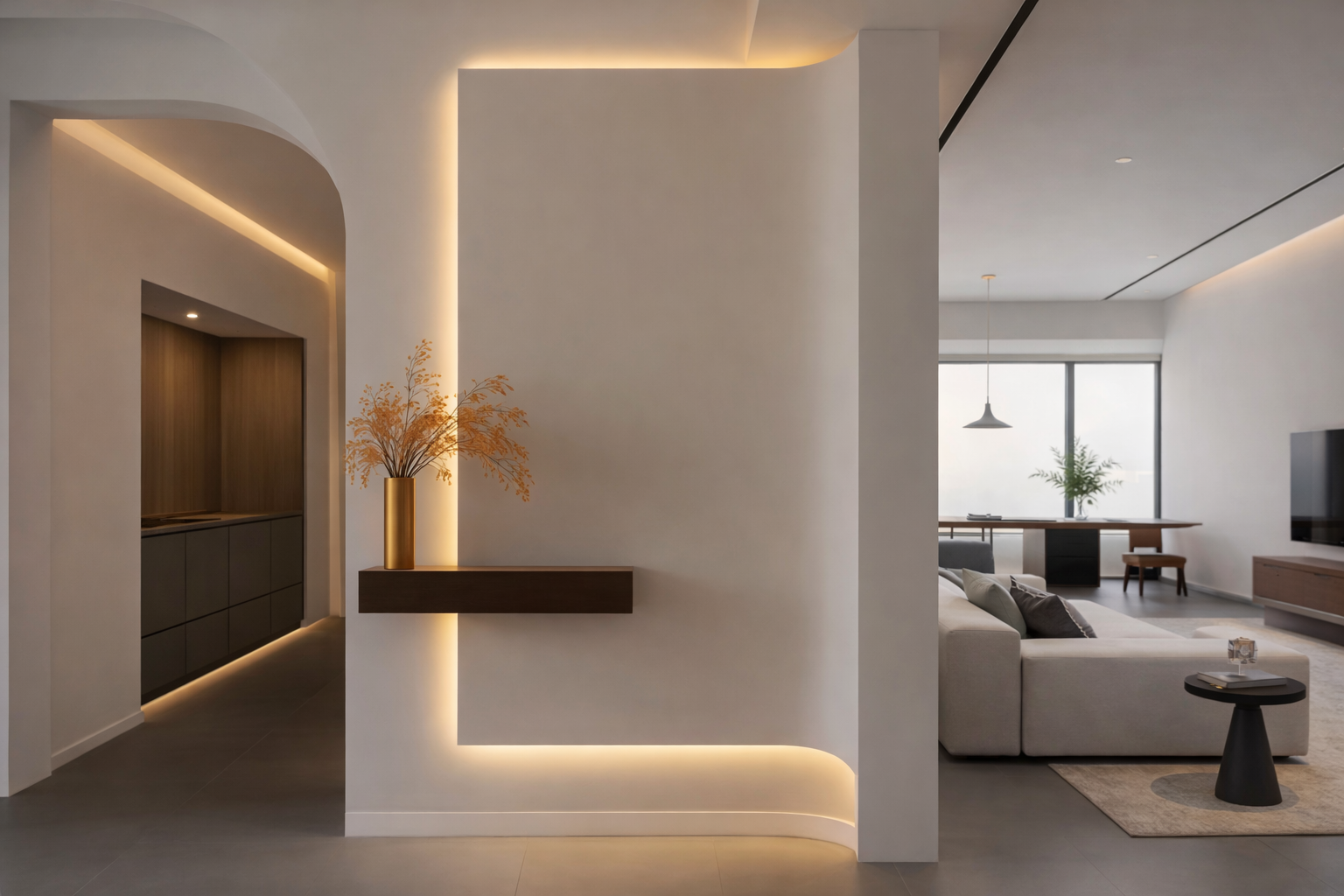 The Luma Curve Interior Design Wall Concept blends contemporary minimalism with warm architectural detailing. This design highlights smooth curved edges, hidden LED strip lighting, and a floating wooden console that adds depth and elegance to the space. The neutral color palette enhances natural light while creating a soft, sophisticated ambiance. Perfect for modern homes, luxury apartments, or premium office interiors, this concept focuses on clean lines, subtle textures, and balanced lighting to deliver a refined and welcoming environment.