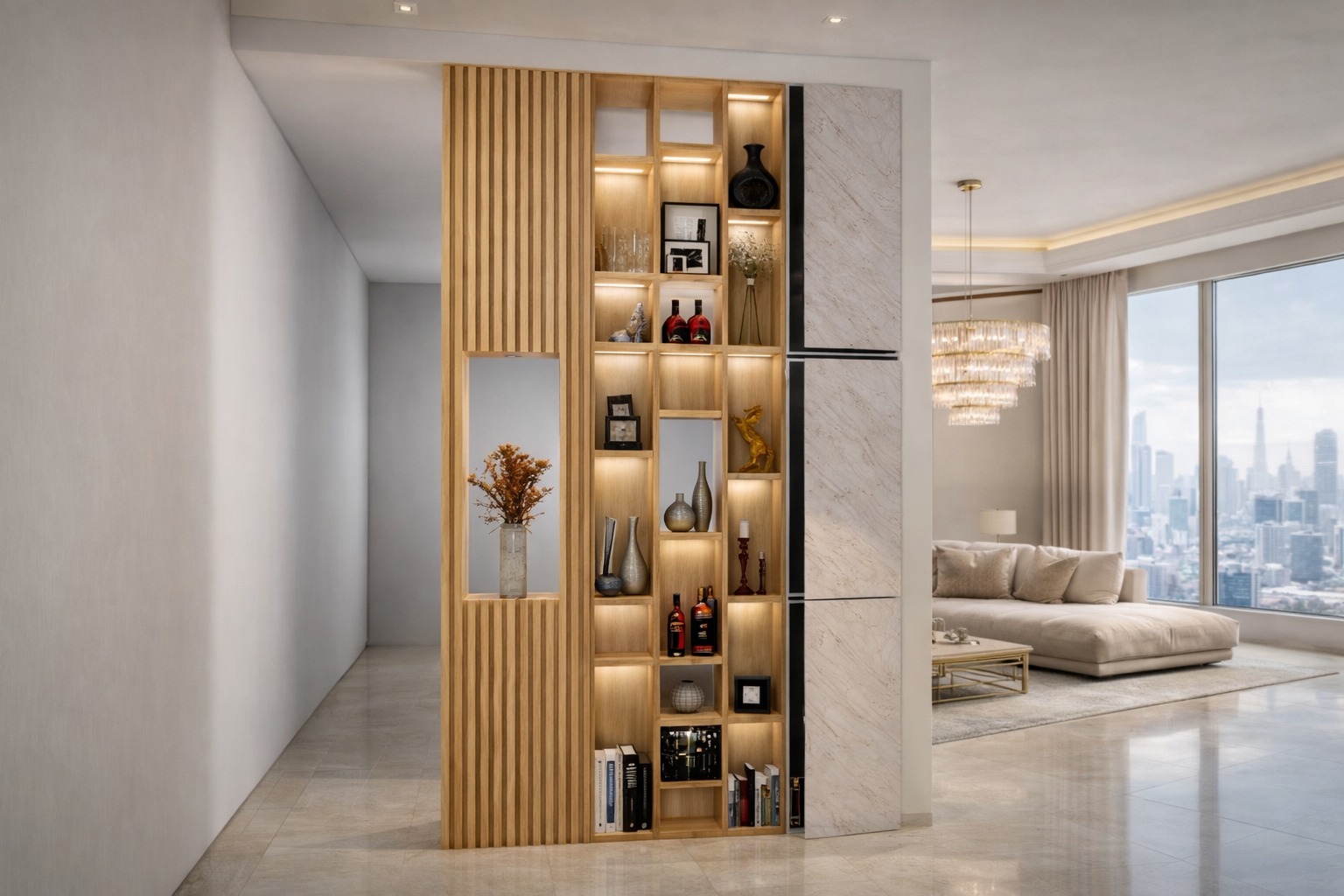 The Lumière Luxe Interior Design Divider Shelf is a premium statement piece created to enhance contemporary living spaces. Designed as both a room partition and decorative display unit, it features elegant vertical wooden slats on one side and illuminated open shelving on the other, offering a seamless blend of privacy and openness.
