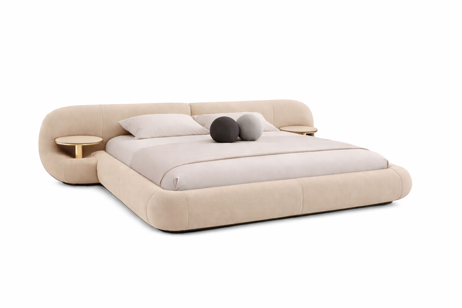 The bed features an extended upholstered frame with built-in side tables on both ends, offering both style and convenience. The padded headboard provides comfortable support, making it ideal for relaxing, reading, or unwinding after a long day.