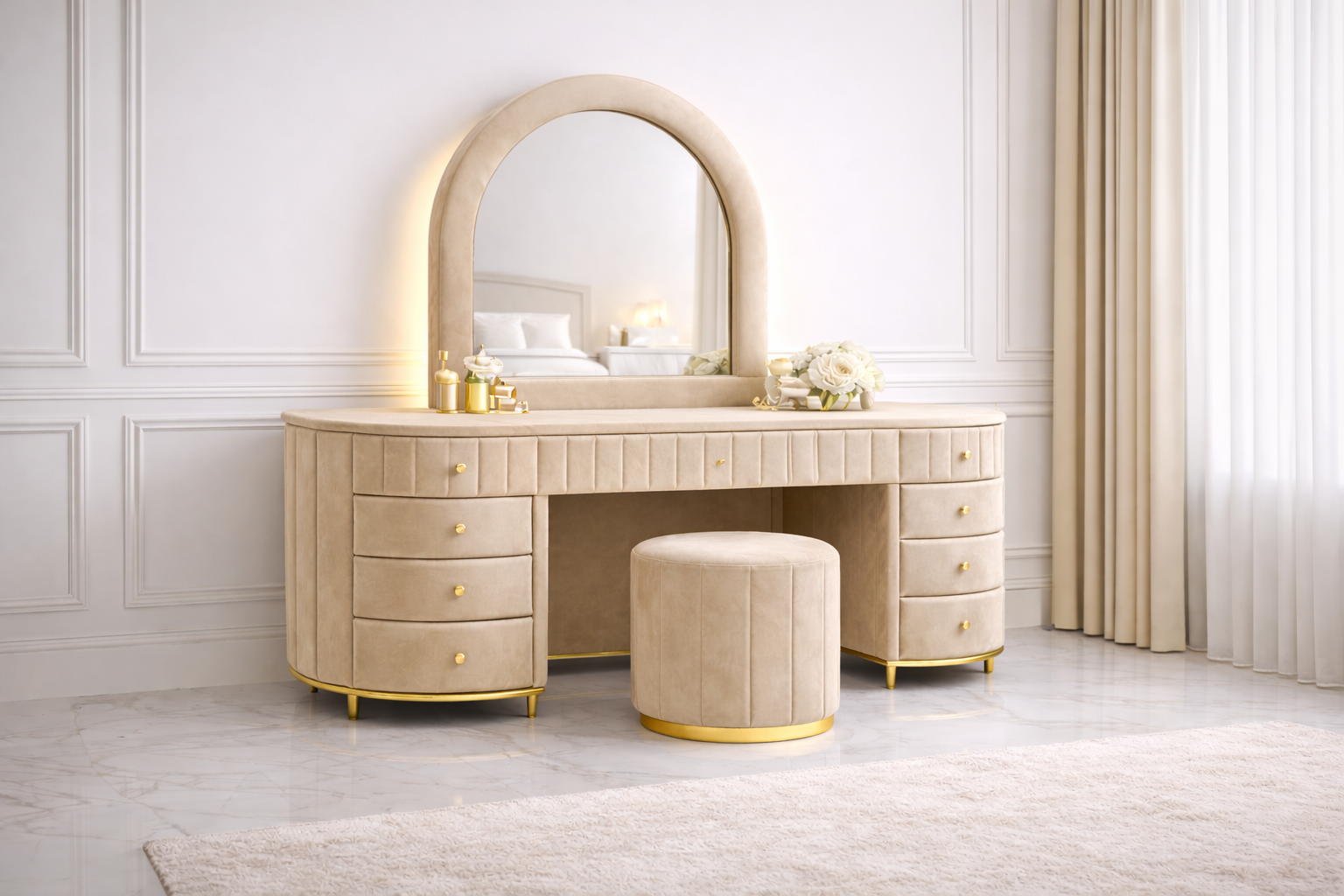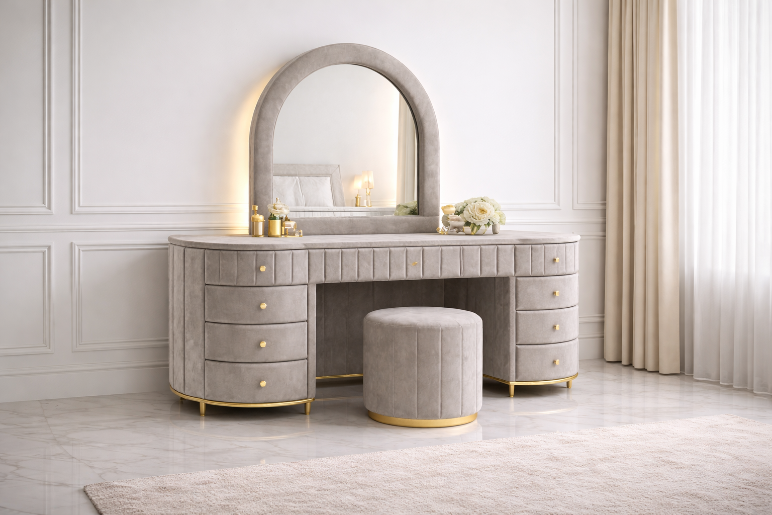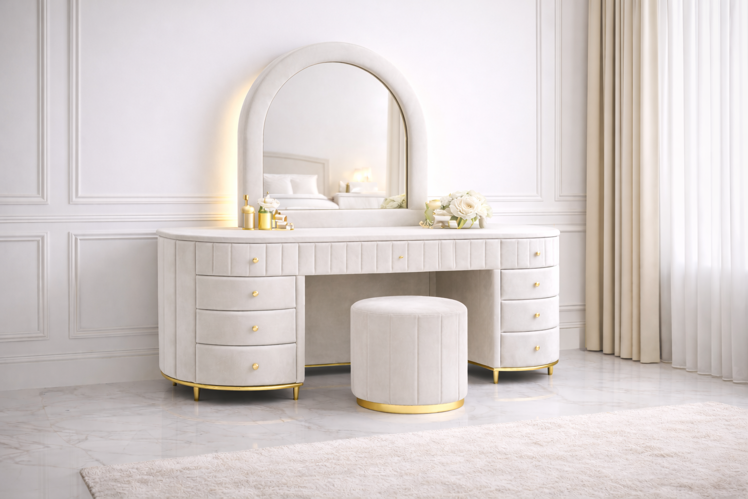 The Luxe Arc Dressing Table is crafted to elevate your daily routine with a perfect blend of style and functionality. Featuring a refined arched mirror and a smooth, upholstered structure, this dressing table adds a statement of modern luxury to any bedroom.