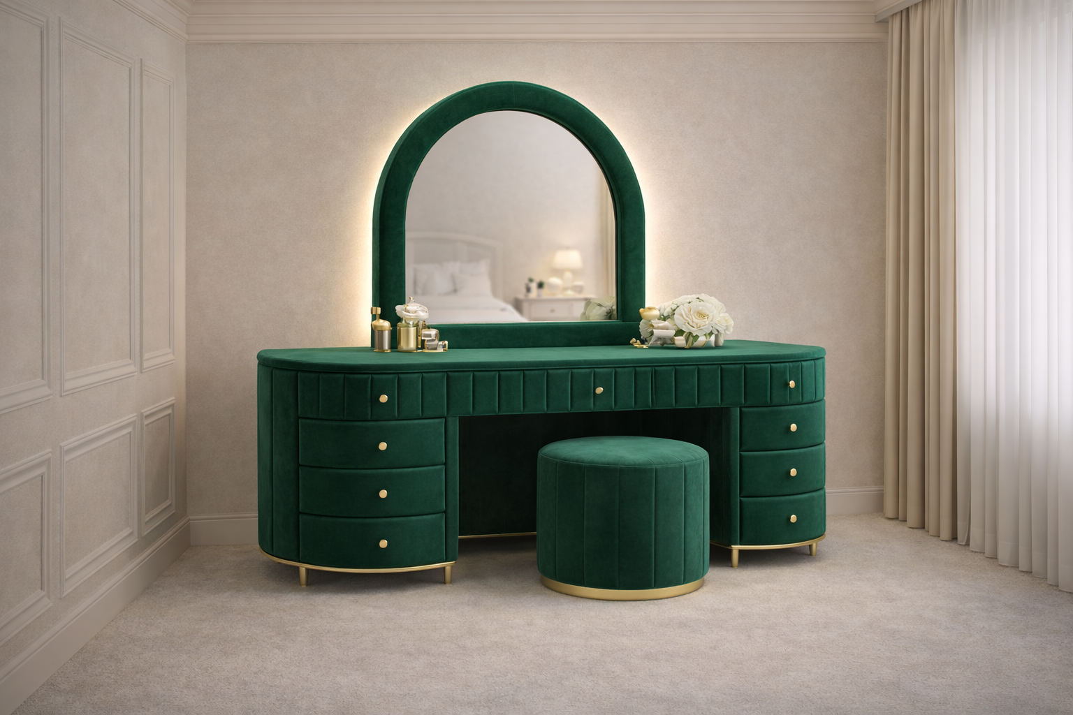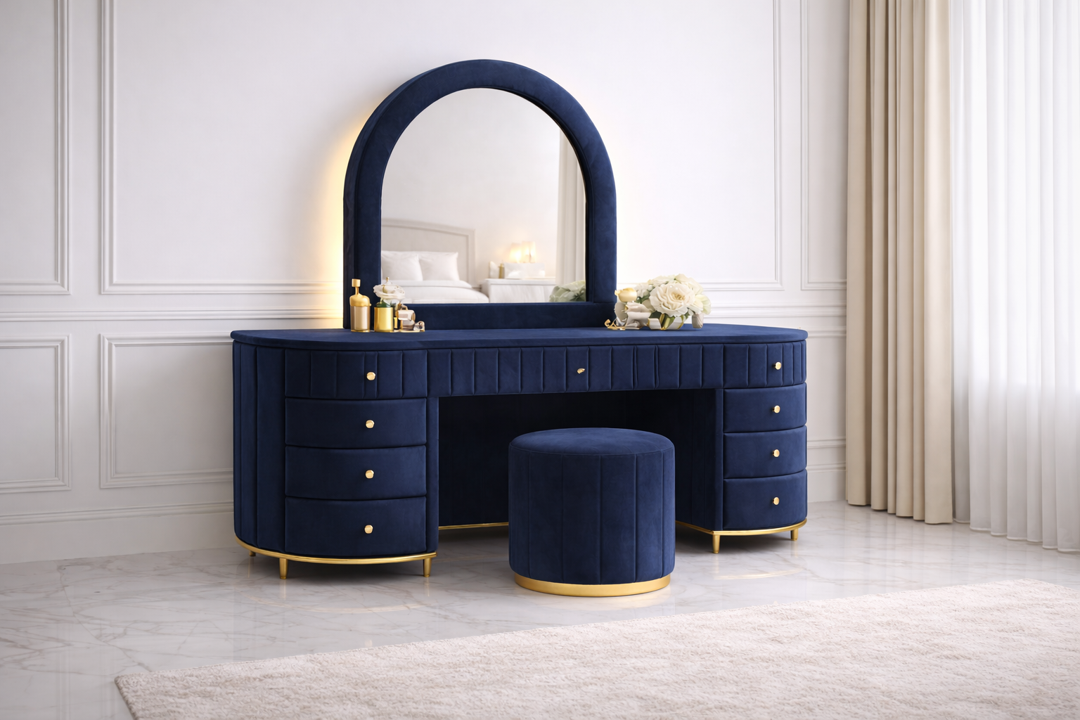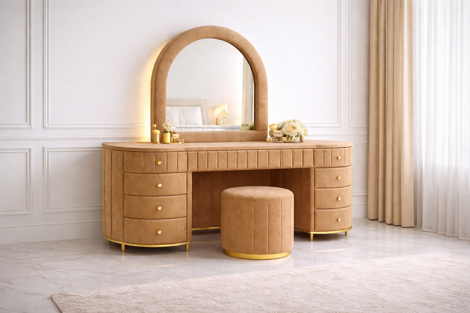 The Luxe Arc Dressing Table is crafted to elevate your daily routine with a perfect blend of style and functionality. Featuring a refined arched mirror and a smooth, upholstered structure, this dressing table adds a statement of modern luxury to any bedroom.