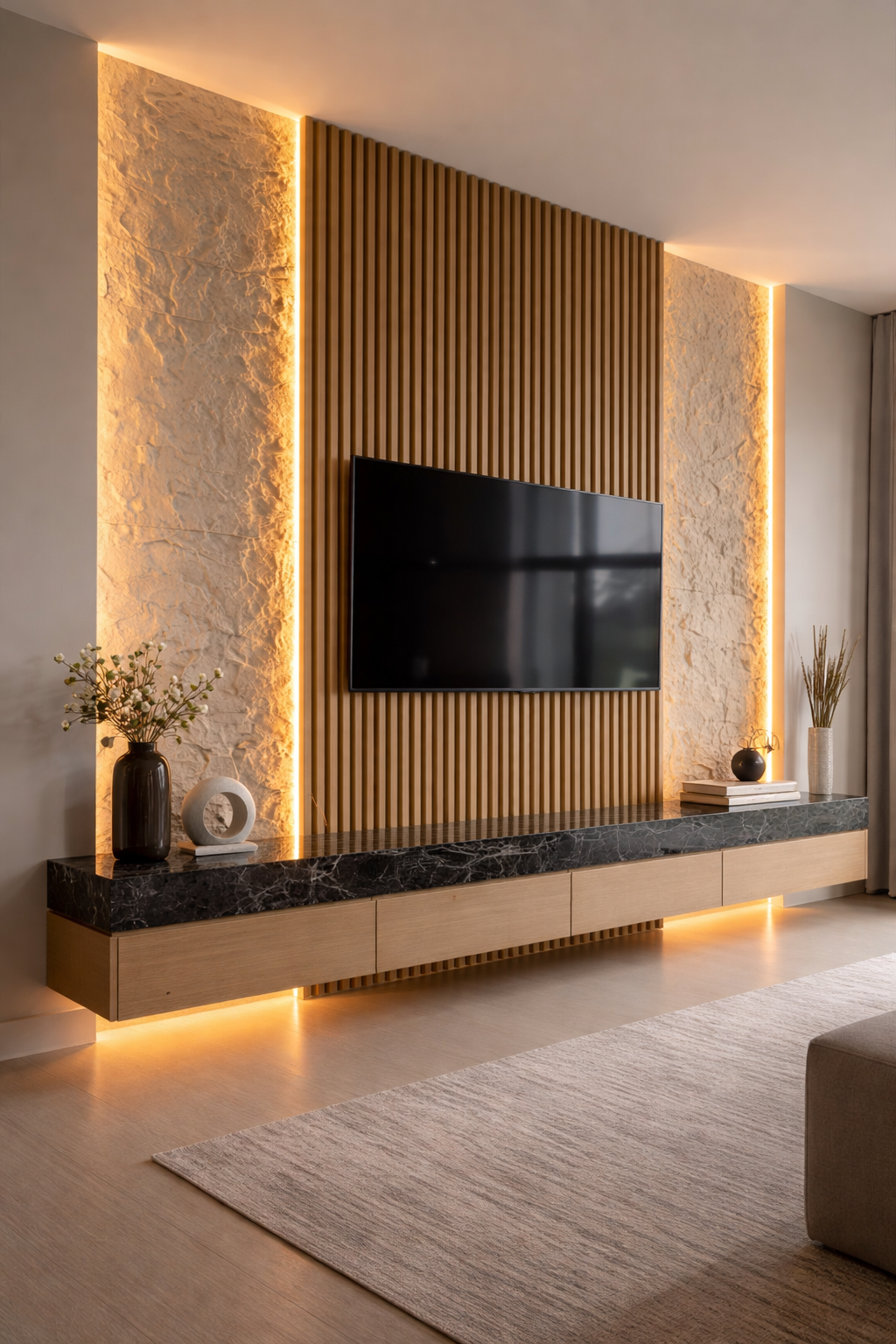 Upgrade your living room with the Luxe Glow Floating TV Unit, exclusively crafted by Siraj Carpentry. This contemporary wall-mounted TV console features a stunning vertical wooden panel design combined with textured side finishes and integrated warm LED lighting to create a luxurious ambiance.