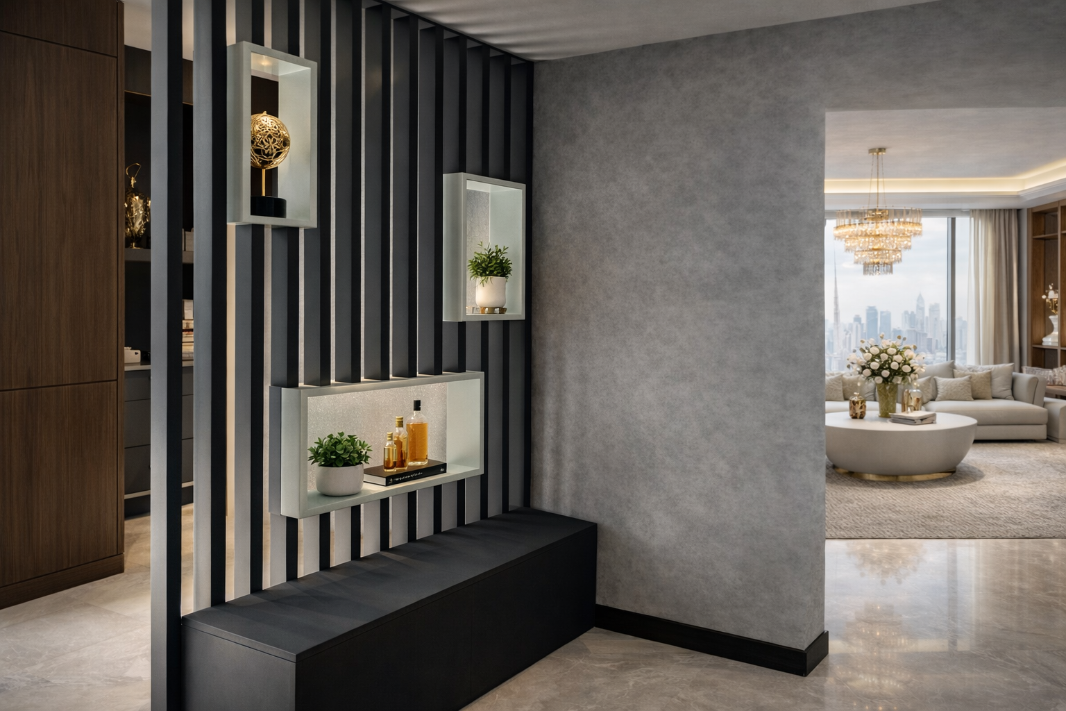 Midnight Slate Luxe Partition is a striking representation of modern urban sophistication. Designed to create a subtle division between areas without compromising openness, the dark vertical slatted partition becomes the architectural centerpiece of the space. Its deep charcoal tones contrast beautifully with the soft neutral flooring and textured grey walls, delivering a balanced yet dramatic visual appeal.