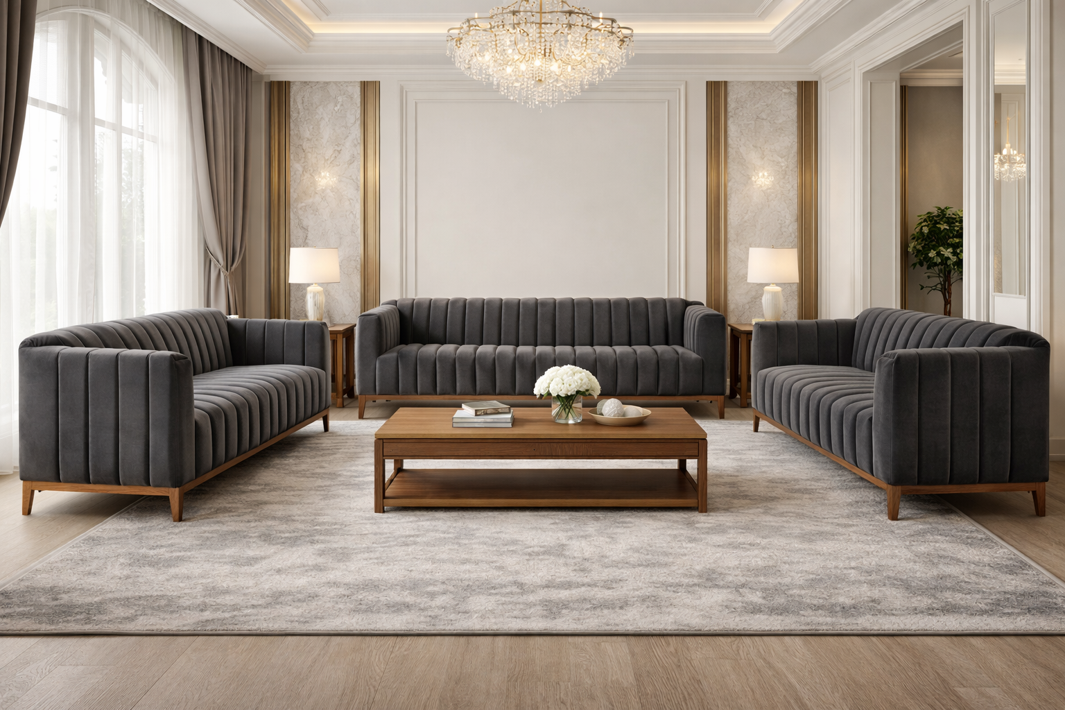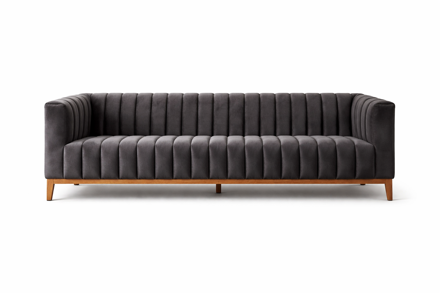 The standout feature is its vertical channel tufted detailing, adding depth, texture, and a modern architectural appeal. Upholstered in premium soft fabric, the sofa offers a plush seating experience while maintaining a clean and structured silhouette.