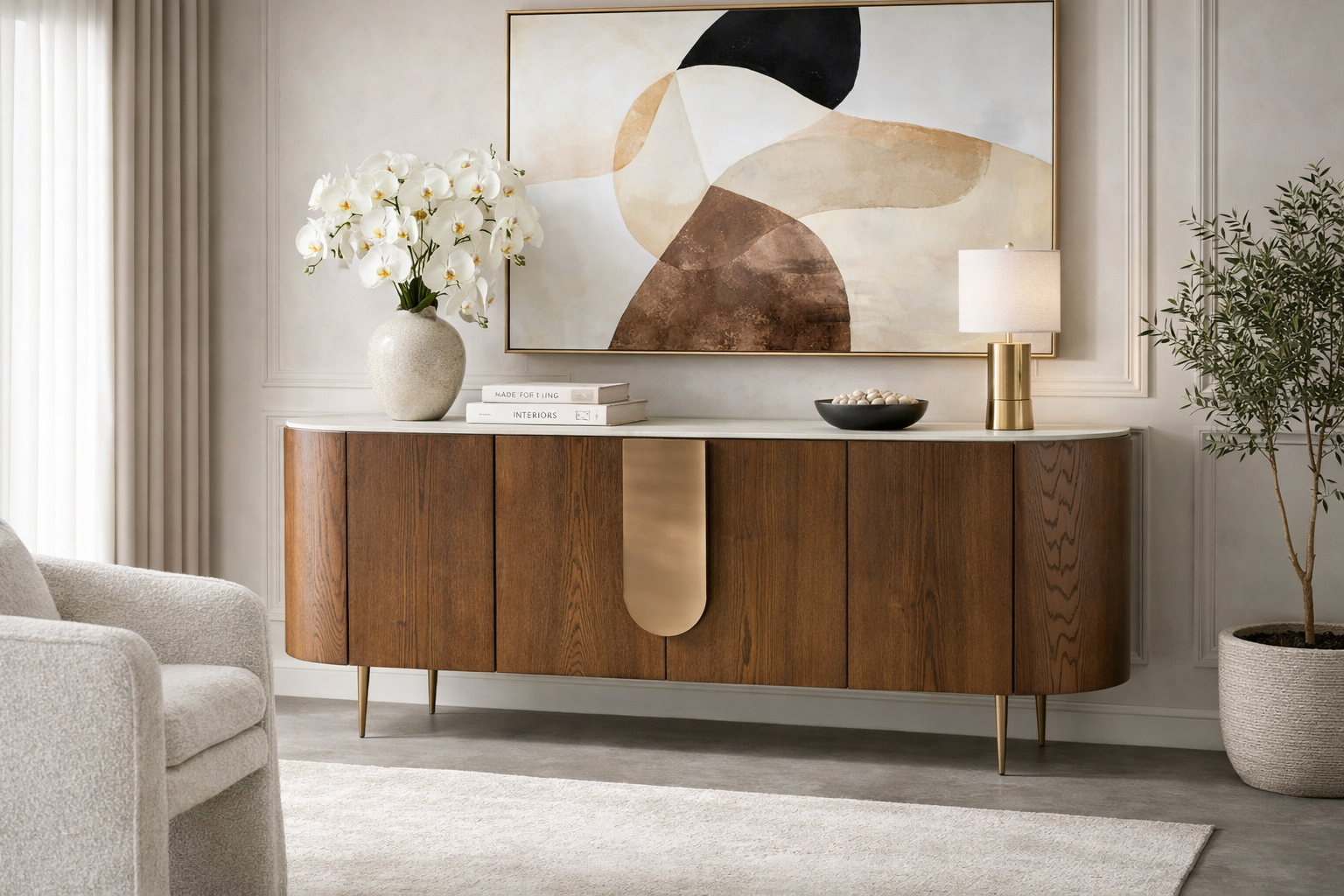 The standout curved cabinet design is complemented by a subtle metallic accent panel, adding a touch of elegance without overpowering the minimalist aesthetic. Spacious concealed storage makes it ideal for organizing dinnerware, table linens, or everyday essentials, while the smooth top surface is perfect for décor styling or serving arrangements.
