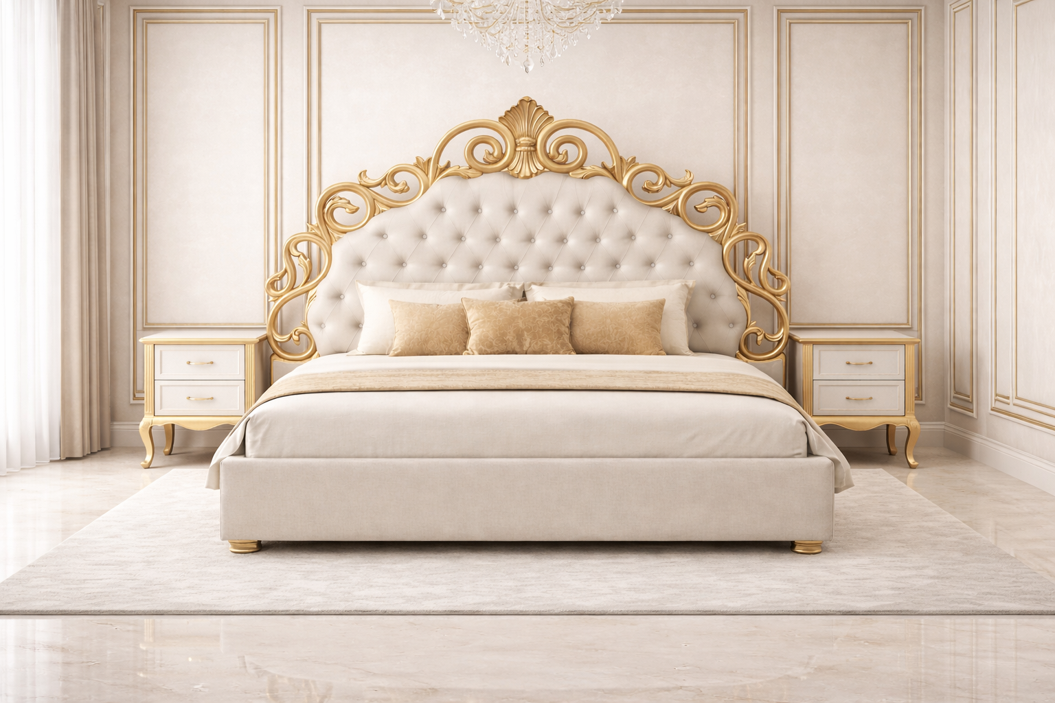 Transform your bedroom into a royal retreat with the Royal Aurelia White & Gold Luxury Bed — a perfect blend of classic craftsmanship and modern luxury. This bed showcases an exquisitely tufted upholstered headboard framed with detailed hand-carved gold accents, inspired by European palace interiors.