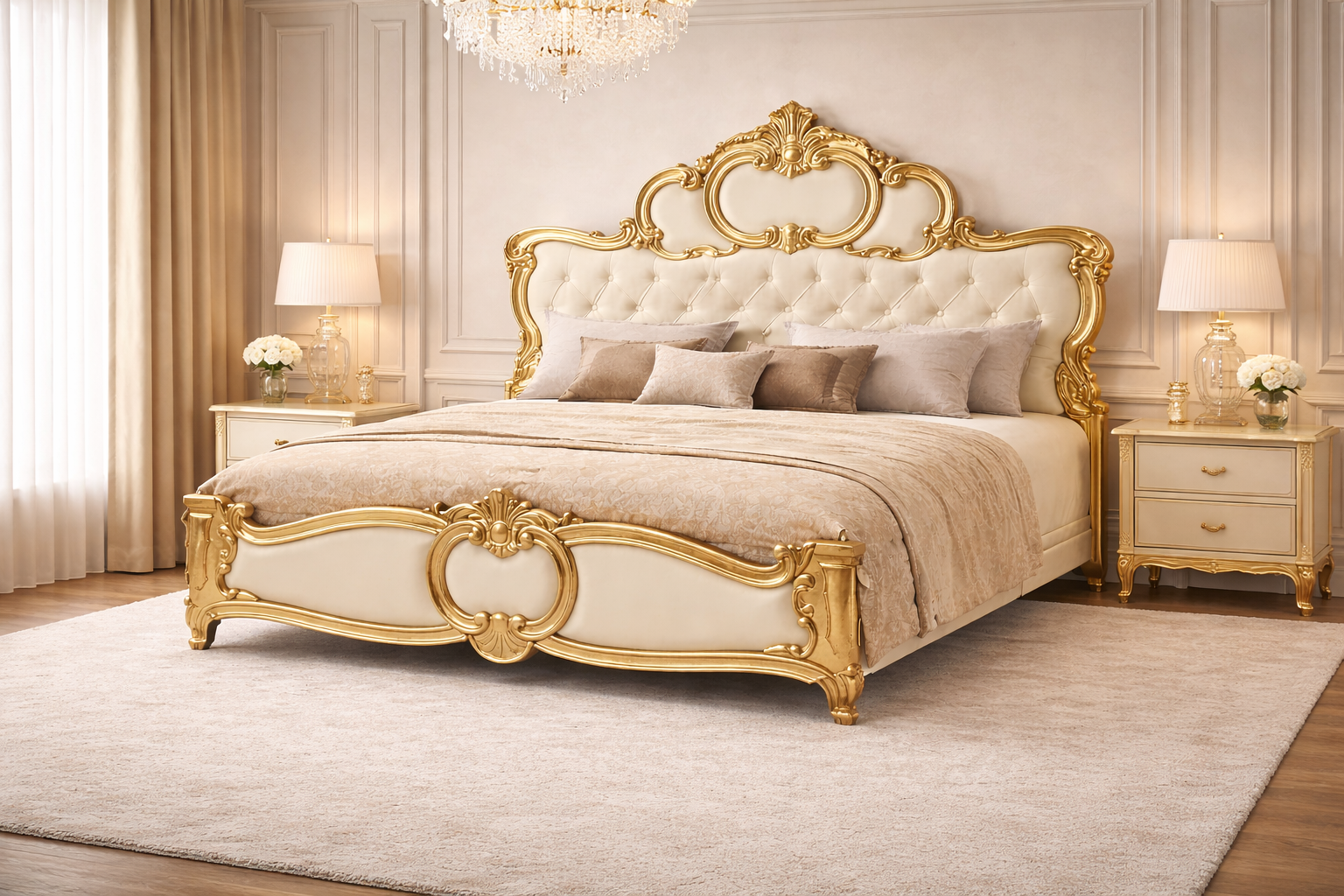 Experience true royal living with the Royal Ivory Gold Carved Bed, a masterpiece inspired by classic palace interiors. Designed with intricate hand-carved detailing and a luxurious ivory base highlighted with gold accents, this bed makes a bold statement of elegance and grandeur.