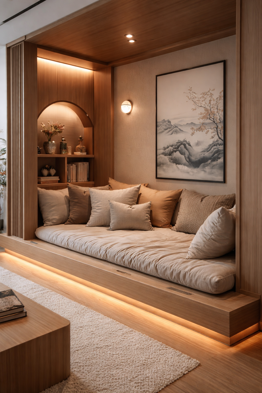 The Serenity Arch Panel Wall is a sophisticated wall panel composition that blends architectural detailing with modern warmth. Framed in rich wood paneling, the design centers around a recessed arched niche that adds softness and character to the vertical structure. Integrated shelving within the niche provides functional display space, while concealed LED strip lighting beneath the platform and along the upper panels creates a floating, ambient glow that enhances depth and texture.