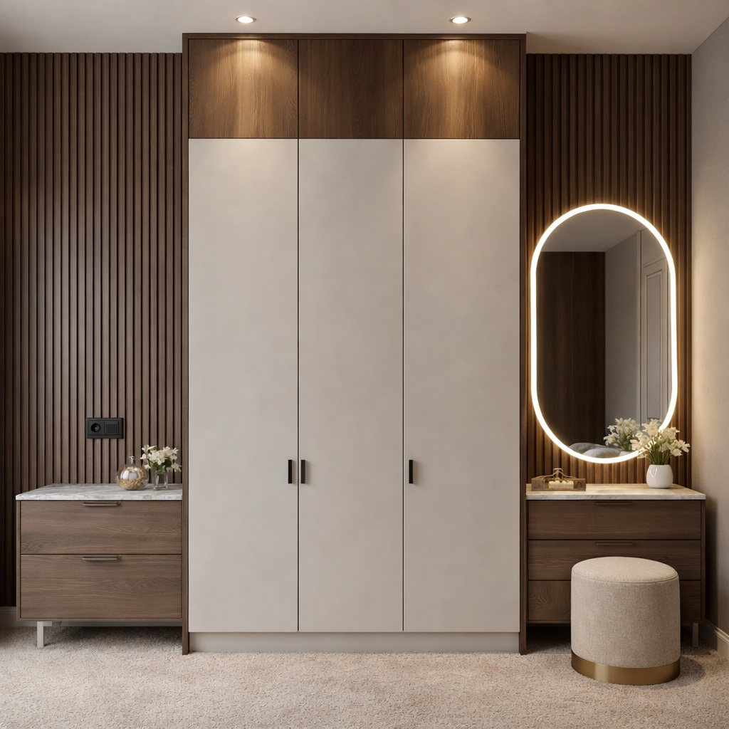 Transform your bedroom wall into a complete lifestyle hub with the Aura Pavilion system. This expansive unit features a central three-door matte white wardrobe flanked by symmetrical walnut-finish stations—a professional-grade vanity with a halo-lit mirror on one side, and a matching auxiliary chest on the other—all set against a striking fluted timber backdrop.