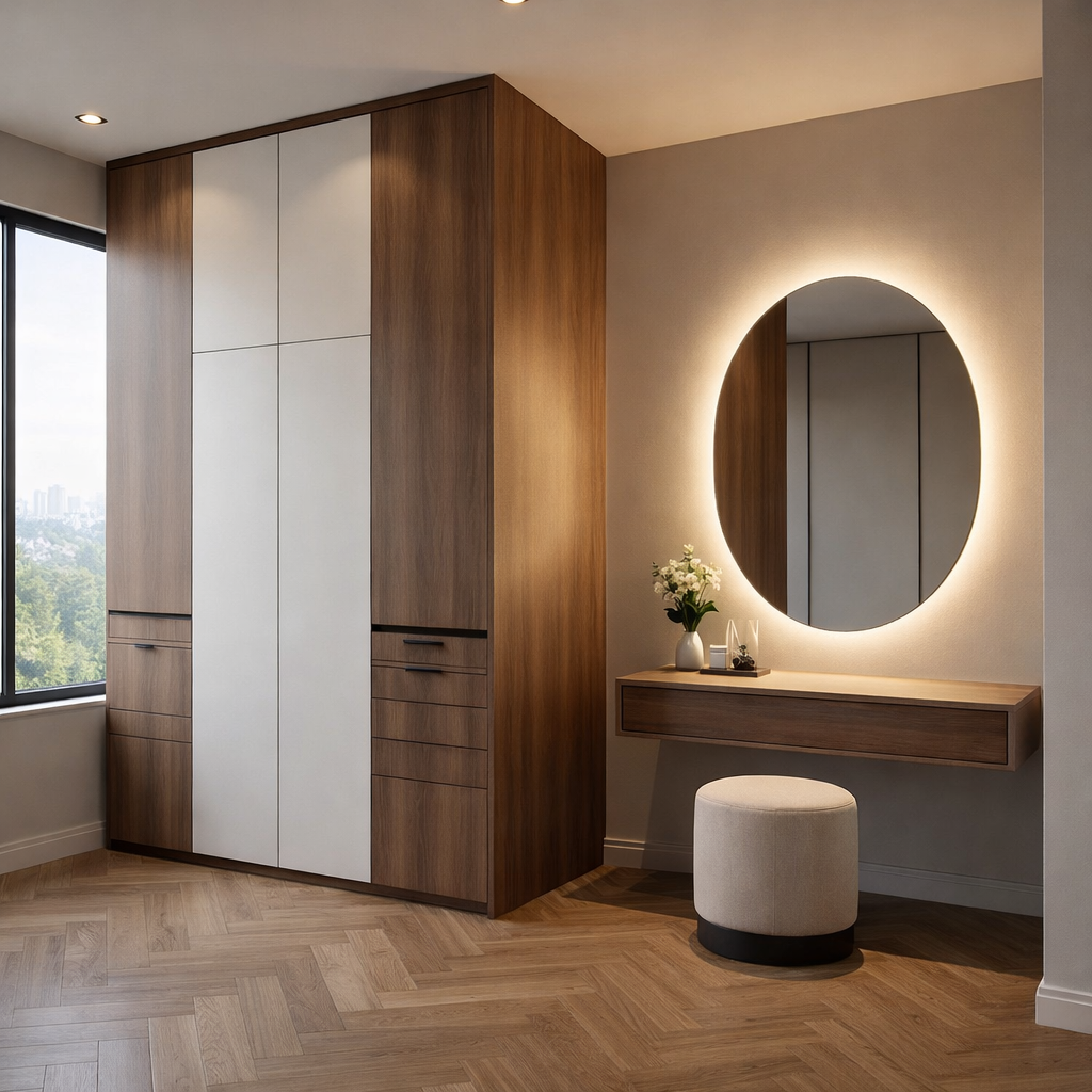 The Aura Suite is a masterclass in architectural furniture, designed to provide a seamless “built-in” look while offering versatile storage options. By merging a high-capacity wardrobe with a professional-grade vanity, it creates a clean, organized sanctuary in any master suite.