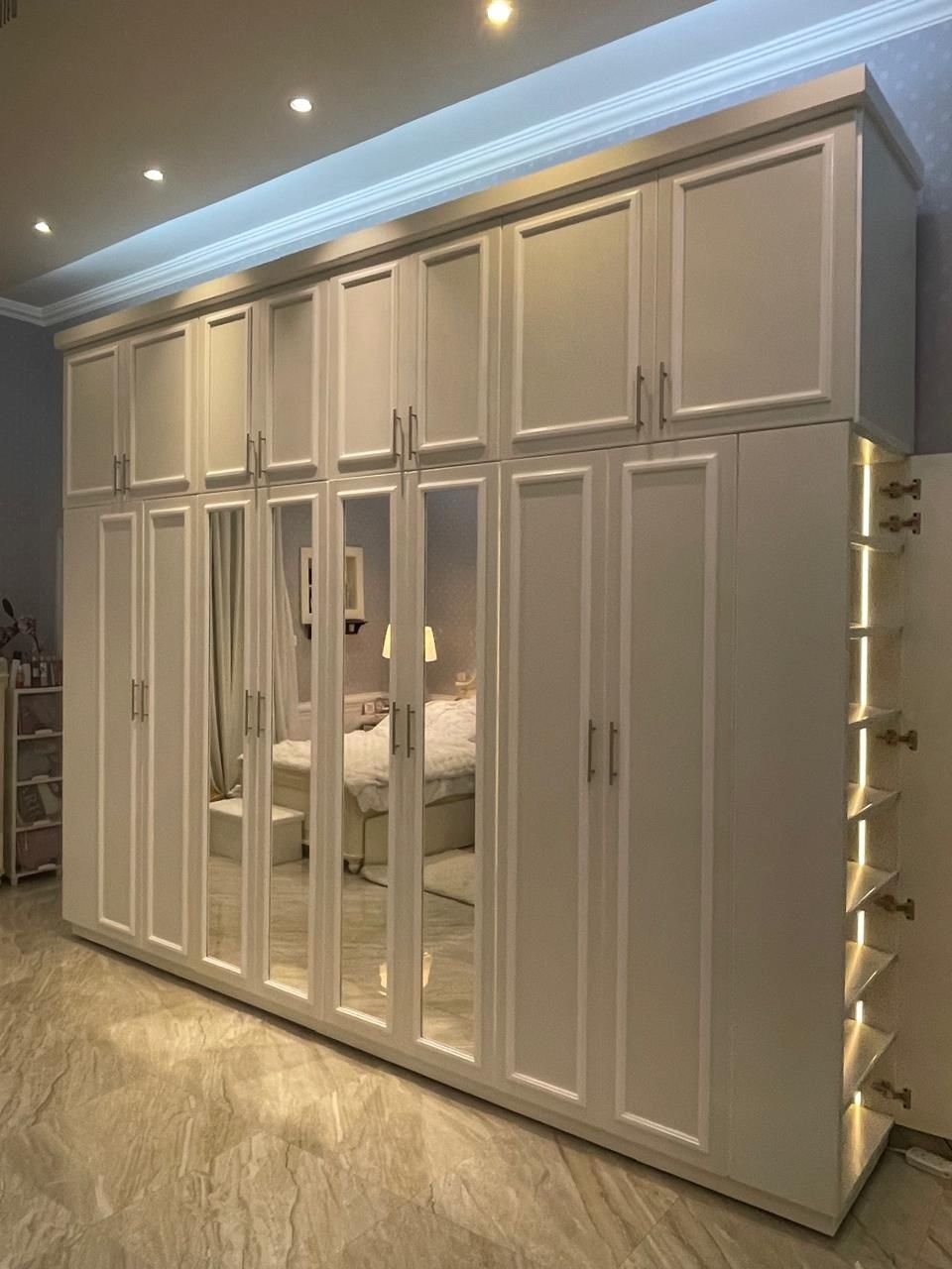 The Heritage Mirrored Grand is an elite storage solution featuring a crisp white finish and recessed Shaker panels. This eight-door system is elevated by four central mirrored panels for a full-length dressing experience and a specialized, side-access illuminated shelving unit for curated accessory storage.