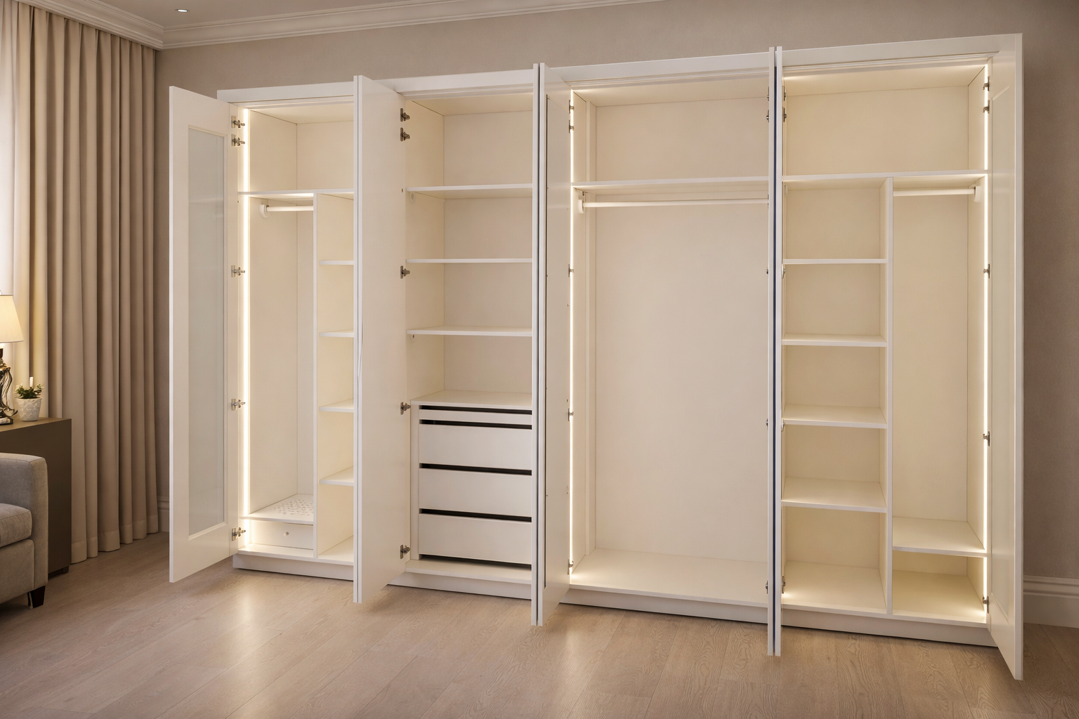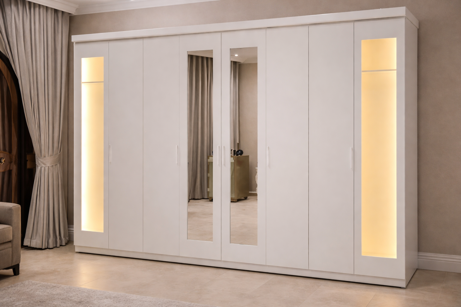 The Horizon Wardrobe is designed to be a focal point of light and organization. By merging traditional storage with integrated lighting and reflective surfaces, it enhances the sense of space and brightness in any room.