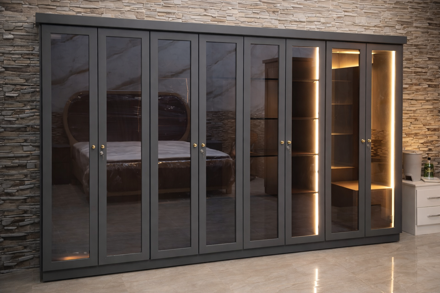The Noir Glass Exhibit is designed for those who want to showcase their wardrobe while maintaining an organized and secure environment. Its bold, dark silhouette and reflective surfaces make it a stunning centerpiece for industrial or modern minimalist bedrooms.